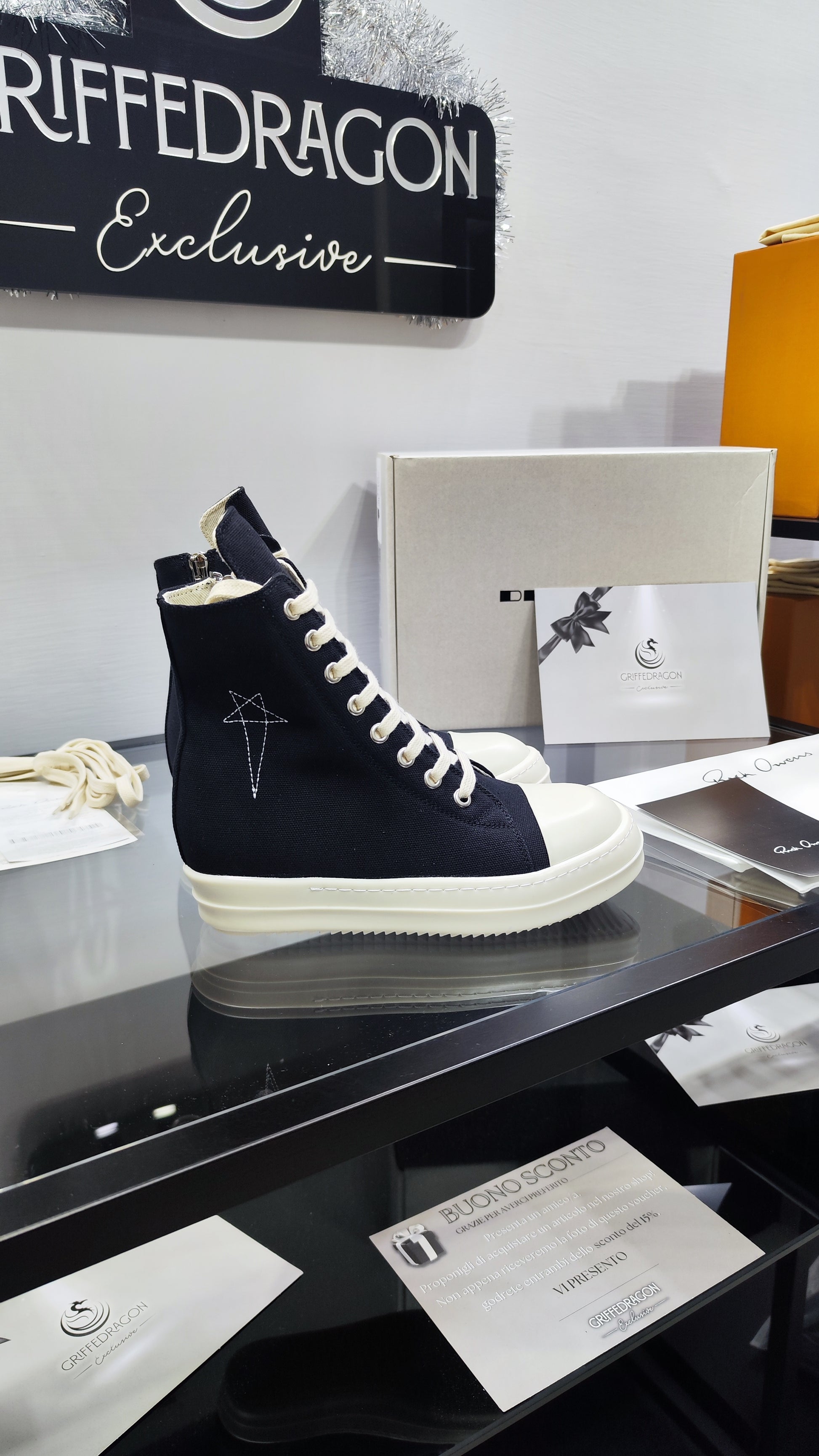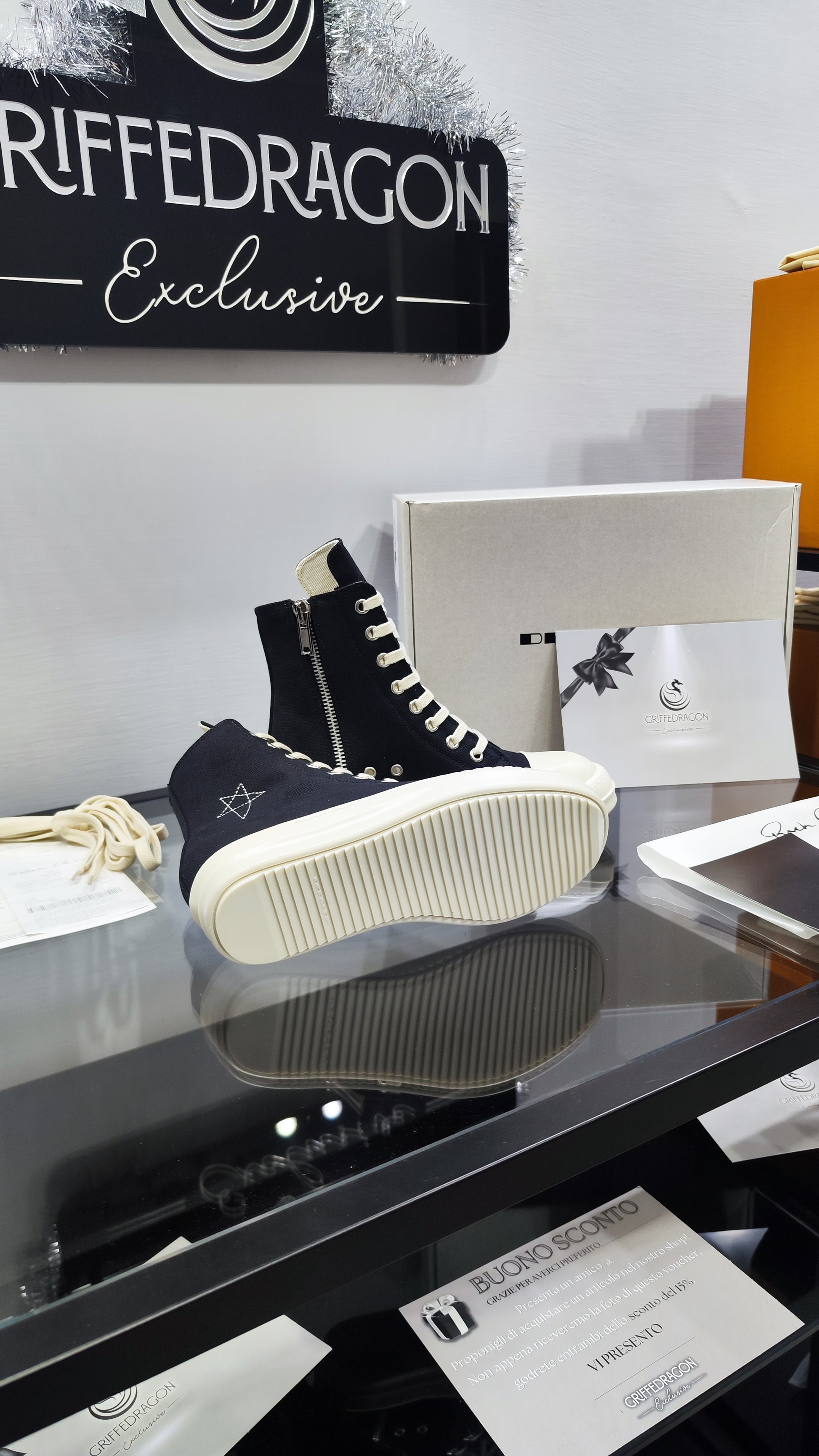 Raw. Iconiche. Inconfondibili. Le high-top di Rick: suola exaggerated, zip laterale e attitude dark. Solo per chi osa.