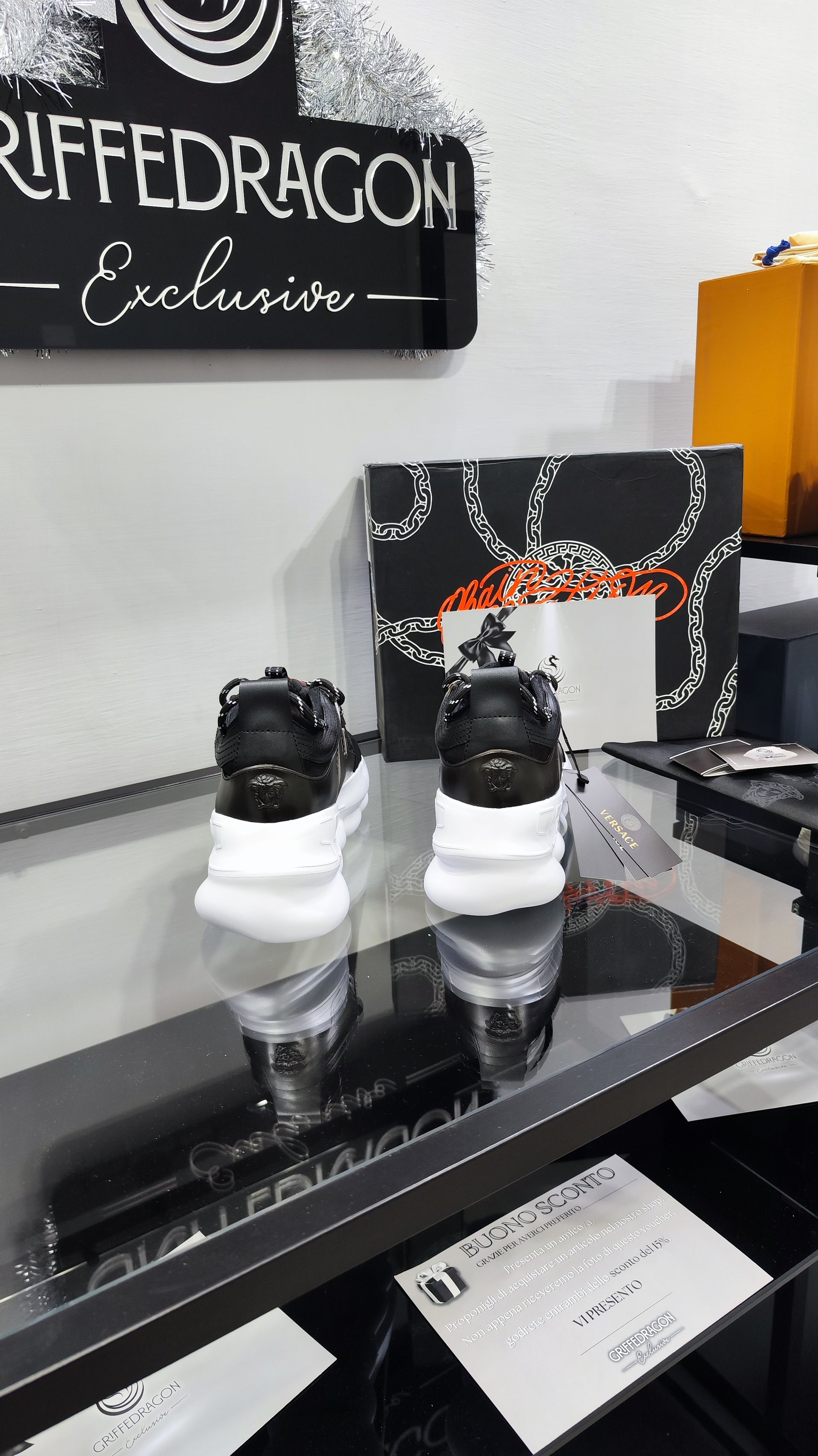 Un’icona dello stile urbano firmata Versace. La Chain Reaction Classic, unisce il design audace della suola a catena con una tomaia total black dallo stile futuristico. Il risultato? Una sneaker grintosa, elegante e d’impatto. Perfetta per chi vuole distinguersi, senza rinunciare al comfort e all’esclusività.